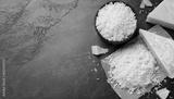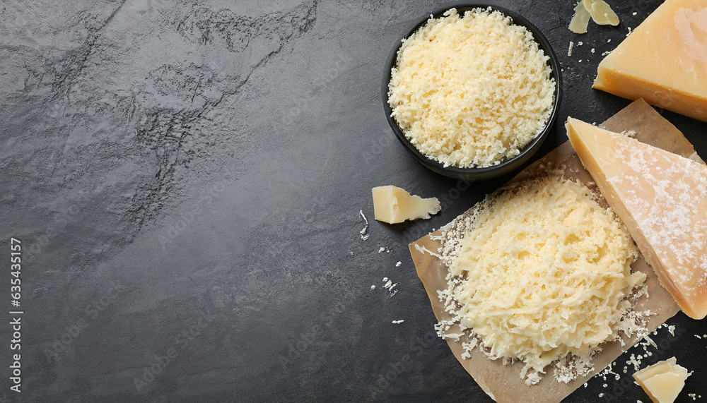 Whole and grated parmesan cheese on black table, flat lay. Space for text