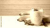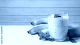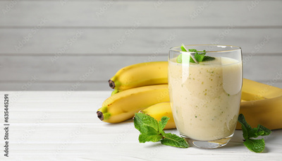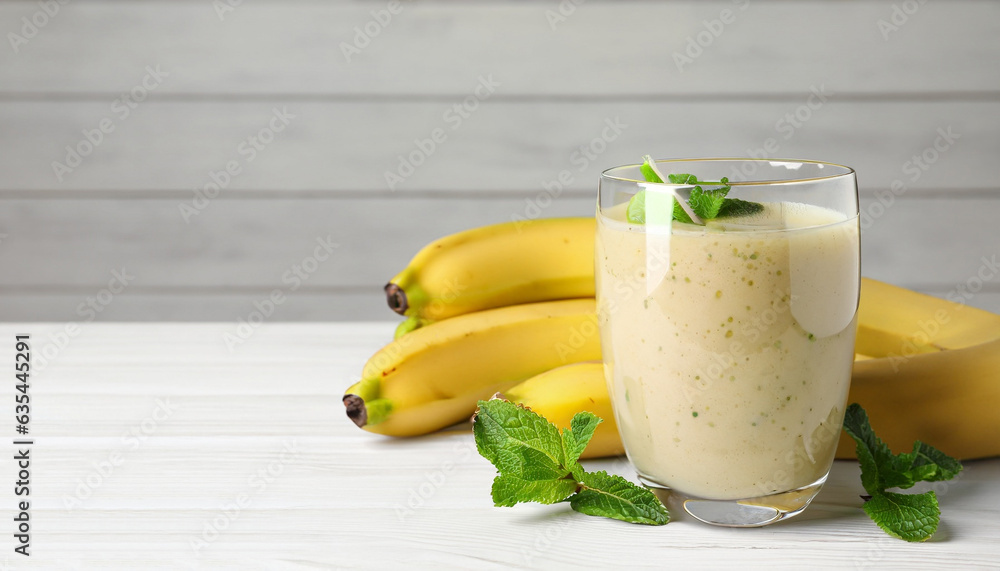 Glass of tasty smoothie, mint and fresh bananas on white wooden table, space for text. Banner design