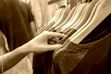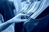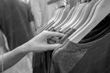 Woman shopping shirt in clothing store. Woman choosing clothes. Shirt on hanger hanging on rack in clothing store. Fashion retail shop inside shopping mall. Clothes on hangers in a clothes shop.