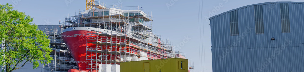 New ferry in construction using crane and scaffolding at Port Glasgow