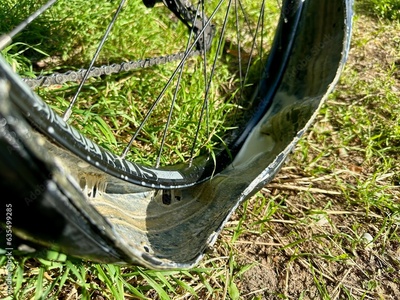 Close-up of Exploded MTB Tire: Sealant Liquid After Bicycle Wheel Blow Up