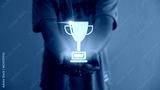 Close up man hands holding champion golden trophy isolated over background.