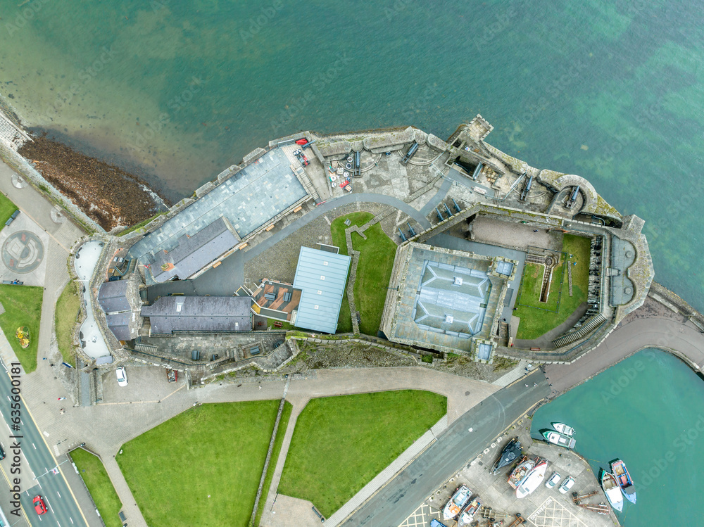 Aerial top down ground plan view of Carrickfergus castle in Northern Ireland UK