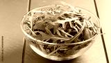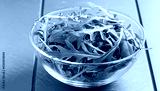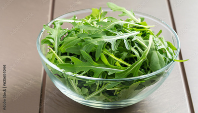 Rocket salad or arugula leaves in glass bowl, horizontal