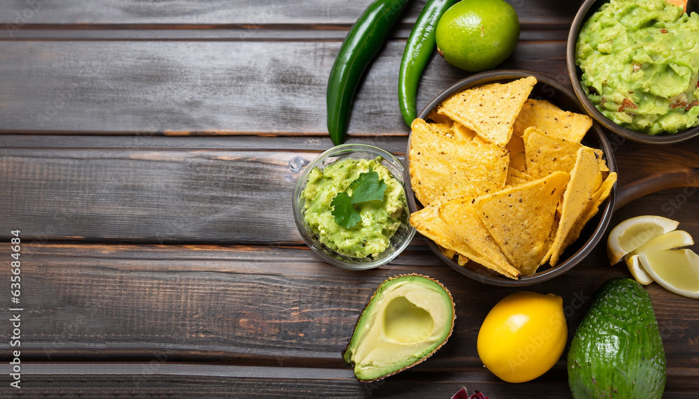 Guacamole nachos and guacamole ingredients on dark wooden background.