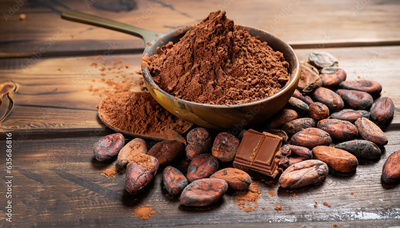 Cocoa beans, powder, crushed cocoa beans and chocolate on wooden background.