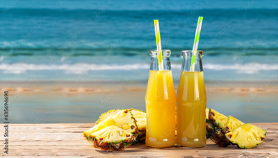 Bottles of pineapple juice with sliced pineapple fruit on wooden table with abstract blue sea background , summer fruit drink concept