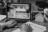 Man using laptop computer to search for real estate rental house or residential condo by internet