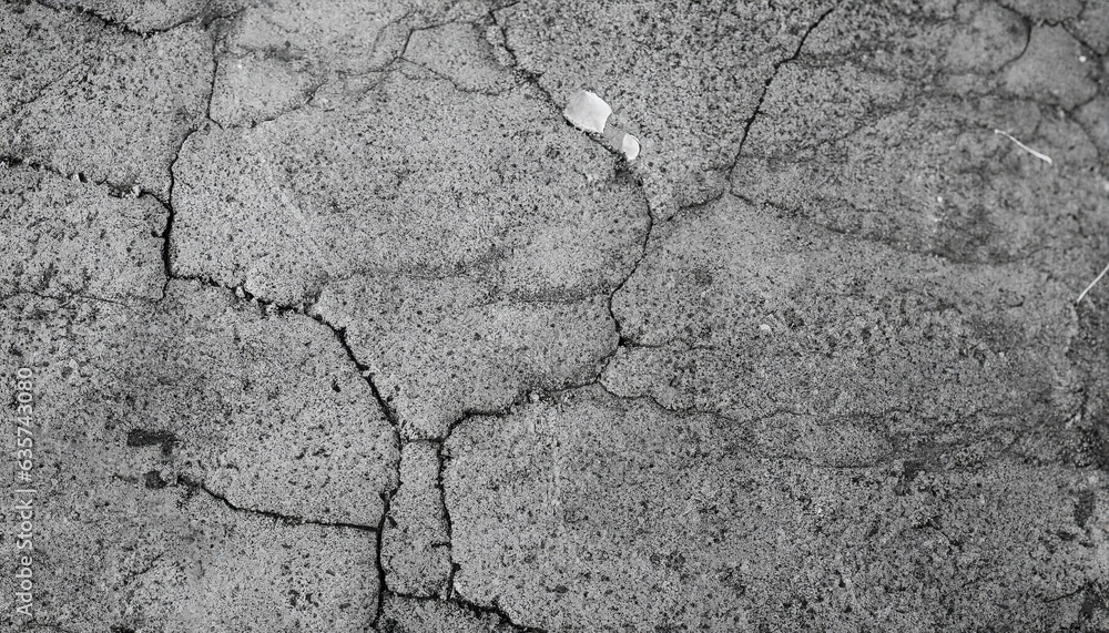 Black and white cement ground background and pattern. It is cracked of concrete street road and very fractious. The damage is caused by the impact and vibration of the ground and long-time use
