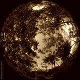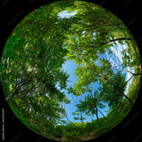 Wide-angle panoramic view of bushes and trees with green leaves shot through a circular fisheye lens. Spherical fulldome photo format