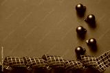 Red Christmas background. Top view photo of red christmas tree balls toys, holiday ribbon with empty space on the left. Christmas Eve concept.