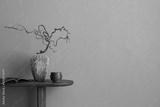 Minimalist composition of warm and cozy living room interior with copy space, wooden consola, stylish vase with branch, book, brown bowl, beige wall and personal accessories. Home decor. Template.