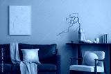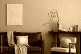 Creative composition of warm and cozy living room interior with mock up poster frame, brown sofa, round coffee table, boucle armchair, simple consola and personal accessories. Home decor. Template.