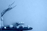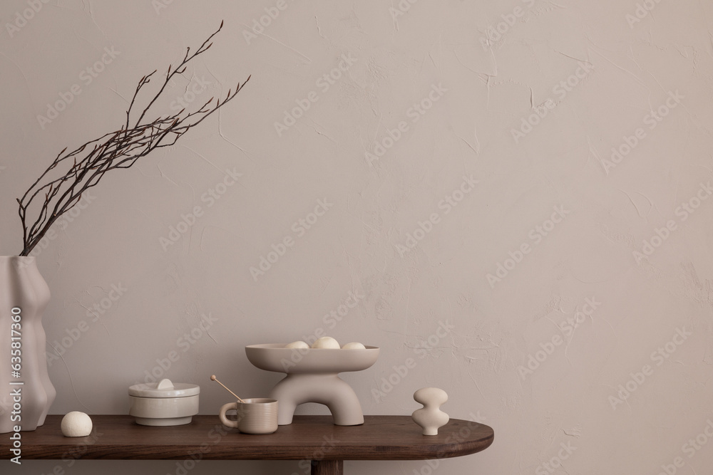 Minimalist composition of warm and cozy living room interior with copy space, wooden consola, stylish vase with branch, cup, sculpture, bowl and personal accessories. Home decor. Template.