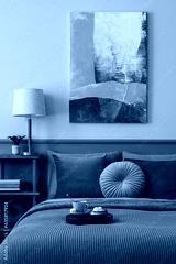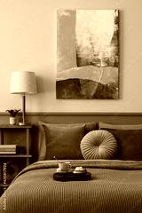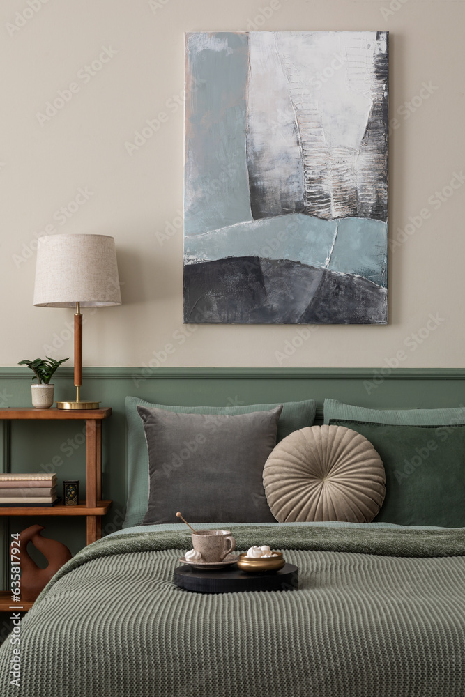 Aesthetic composition of bedroom interior with mock up poster frame, wooden sideboard, sage bedding, armchair, books, plants and personal accessories. Home decor. Template.