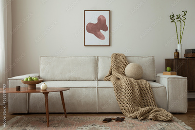 Interior design of living room with mock up poster frame, modern sofa, blanket, wooden coffee table, vase with dried flowers, pillow, commode, carpet and personal accessories. Home decor. Template.