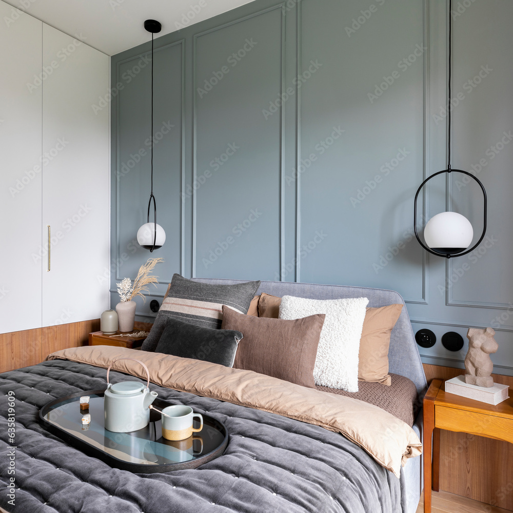 Contemporary design of bedroom interior with brown and grey bedding, pillows, bedside table, vase with dried flowers, trace with cup, hanging lamp and personal accessories. Home decor. Template.