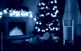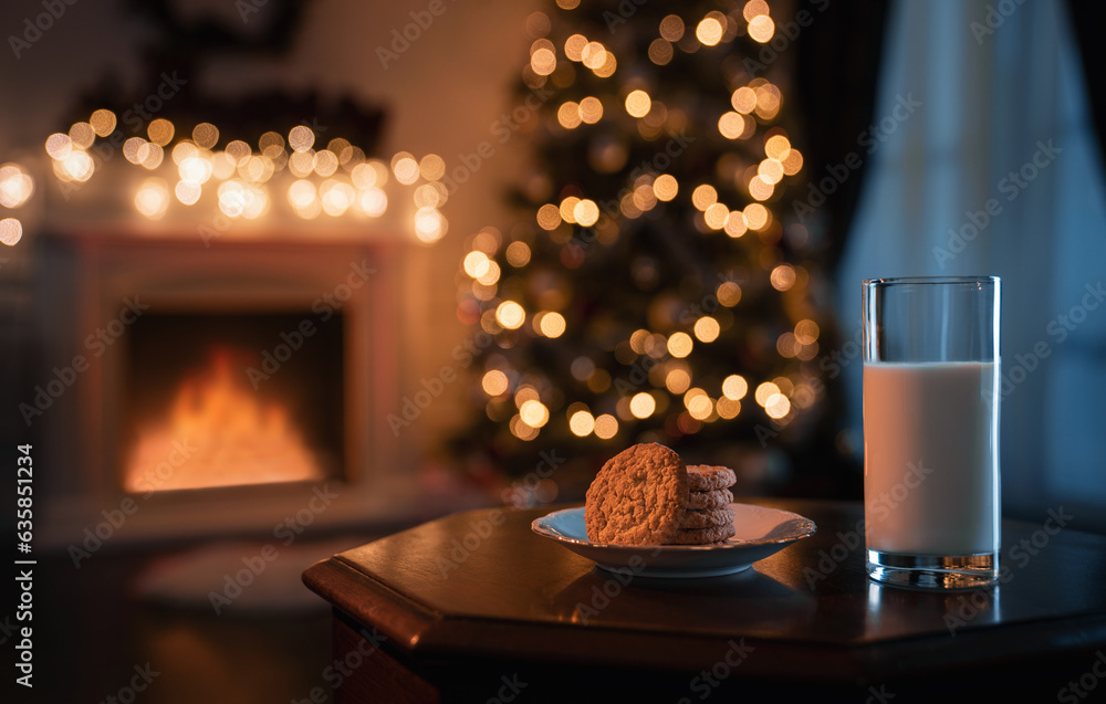 Cozy christmas room at night with glass of milk and cookies prepared for the Santa Claus