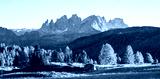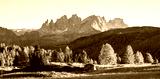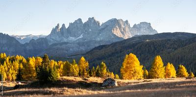 Incredible autumn view at Valfreda valley in Italian Dolomite Alps. Yellow and orange larches forest and snowy mountains peaks on background. Dolomites, Italy. Landscape photography