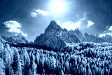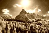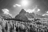 Incredible autumn view at Italian Dolomite Alps. Orange larches forest and foggy mountains peaks on background. Dolomites, Italy. Landscape photography