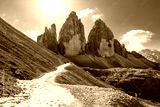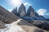 Tourists on the trail on Three Peaks of Lavaredo on autumn time. National Park Tre Cime di Lavaredo, Dolomite Alps mountains, Trentino Alto Adige region, Sudtirol, Dolomites, Italy