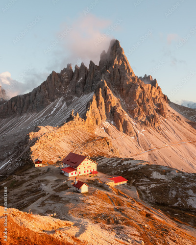 Tre Cime di Lavaredo and rifugio Locatelli in Dolomite Alps during sunset. Three peaks of Lavaredo, Dolomites, South Tyrol, Italy, Europe. Landscape photography