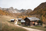 Incredible autumn view at Valfreda valley in Italian Dolomite Alps. Wooden cabins, yellow grass, orange larches forest and snowy mountains peaks on background. Dolomites, Italy. Landscape photography