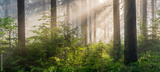 Natural Forest of Spruce Trees with Sunbeams through Fog