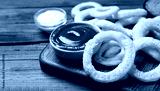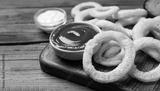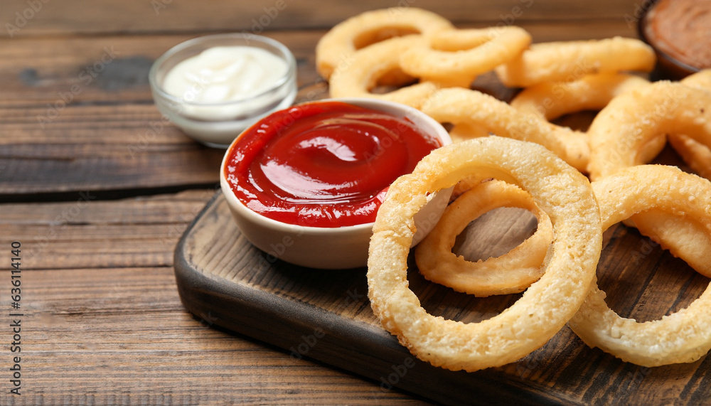 Tasty ketchup and onion rings on wooden table, closeup. Space for text