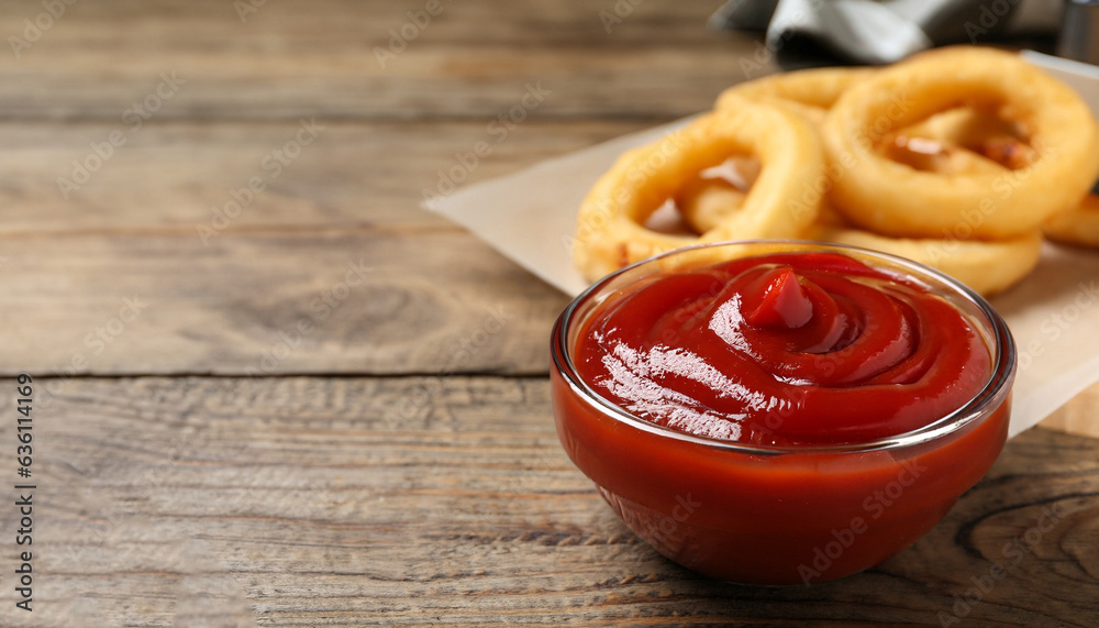 Tasty ketchup and onion rings on wooden table, closeup. Space for text