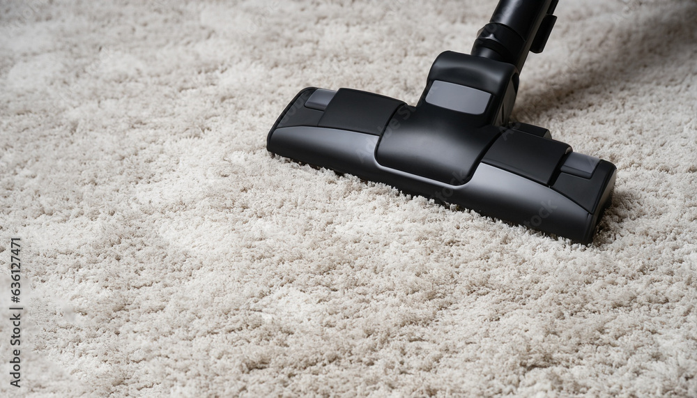 Removing dirt from white carpet with modern vacuum cleaner. Space for text