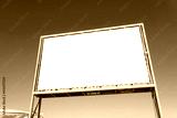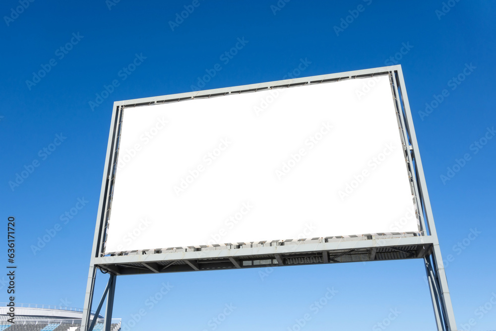 Large horizontal blank advertising poster billboard banner mockup in front of building in urban city, installed freestanding.