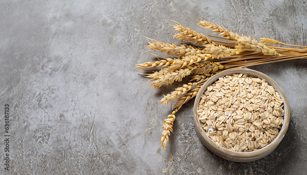 Rolled oats and ears of wheat on concrete background with copy space for text