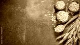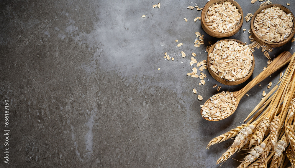 Rolled oats and ears of wheat on concrete background with copy space for text