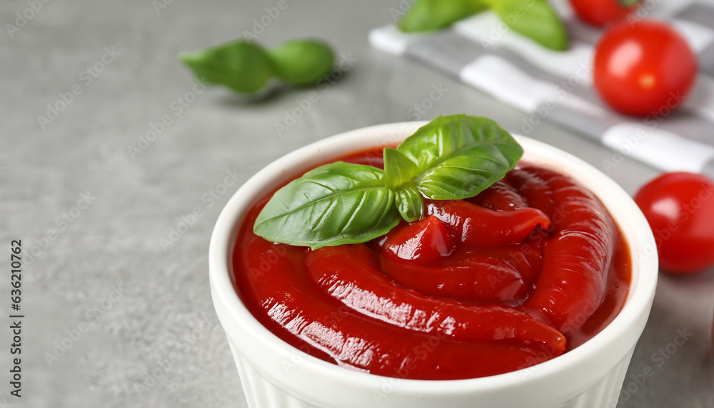 Bowl of tasty ketchup and basil on light grey table, closeup
