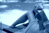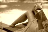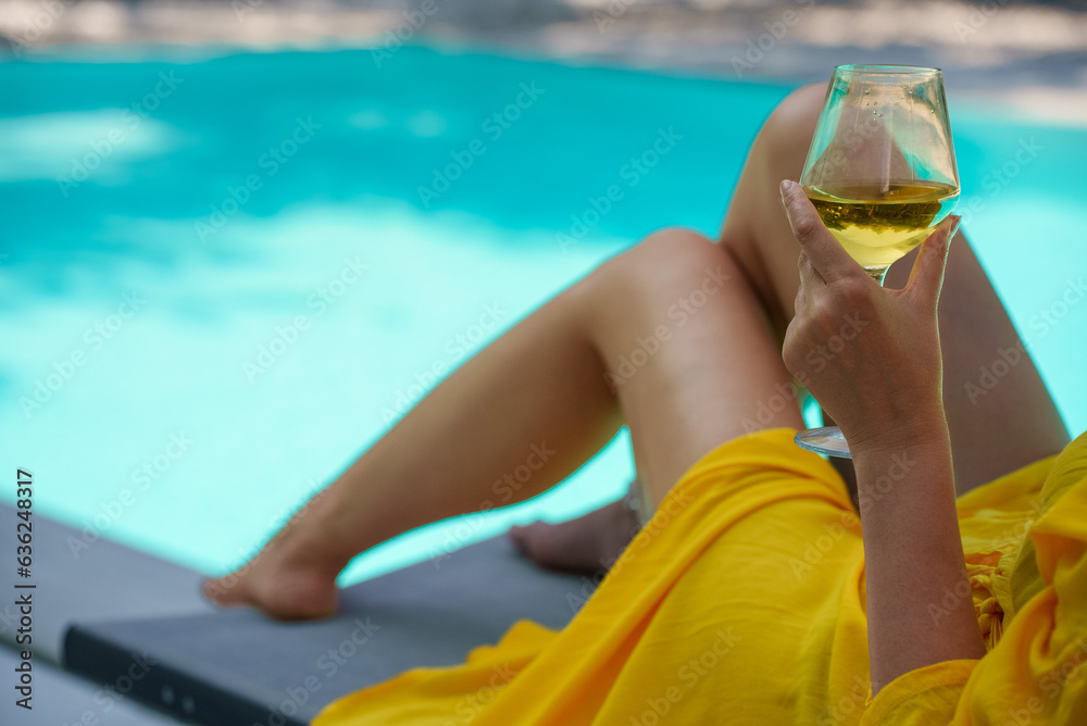 Woman with white glass of wine relaxing near swimming pool.