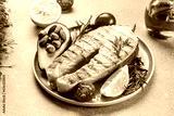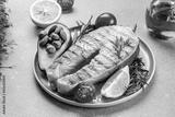 Fresh cooked delicious salmon steak with spices and herbs baked on a grill. Restaurant menu, dieting, cookbook recipe top view