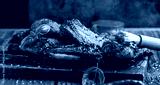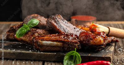 pork ribs grilled with BBQ sauce on a wooden board. Healthy fats, clean eating for weight loss. Long banner format. top view