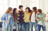 Portrait of a group of young happy smiling friends students or colleagues in casual clothes standing together in the living room at home, hugging and looking cheerful at each other.