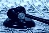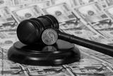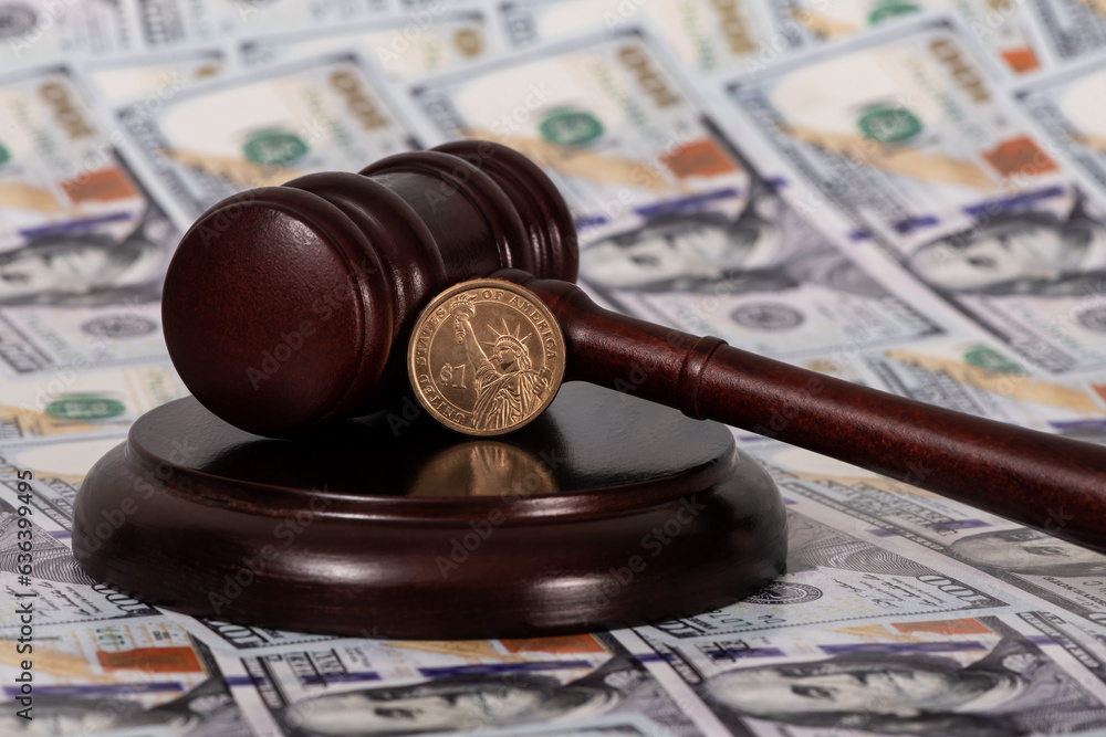 Judge's gavel and 1 US dollar coin against the background of 100 US dollar bills