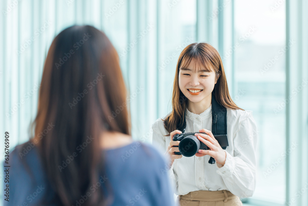 カメラで撮影をする笑顔の女性