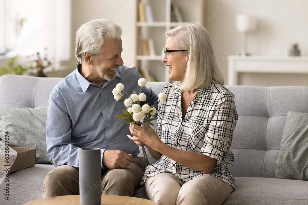 Happy senior couple celebrating wedding day anniversary, sitting on home couch with flowers, smiling, laughing. Positive elder husband giving bouquet to cheerful mature wife