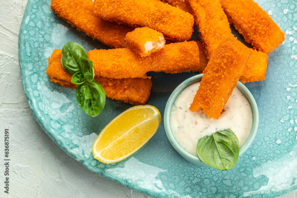 Dish of fishfingers with sauce. Food recipe background. Close up