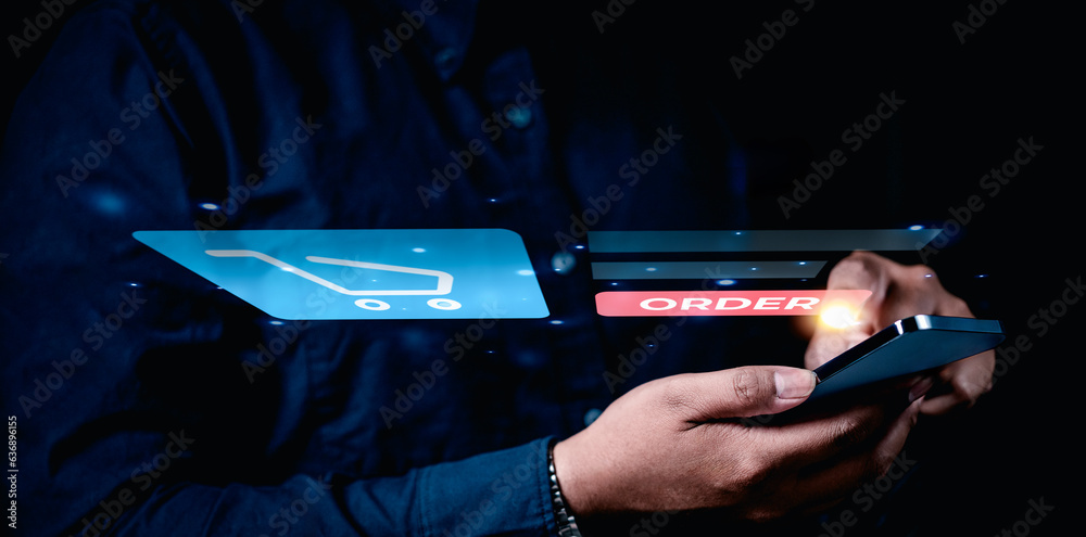 cart, purchase, shopping, online shopping, credit card, online, buying, laptop, banking, pay. touching smartphone for online shopping. put order into cart for purchase, between form has cart symbolic.