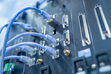 Network hardware. Internet communicator. Server equipment with wires. Network technologies. Rear panel of electrical equipment. Computer tech. VGA ports. Network wires. Server technologies
