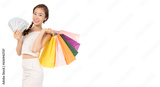 Happy beautiful woman hold shopping bags and money isolated on white background and copy space Smiling happy asian young lady look at camera with happiness Beauty young cheerful female get money back