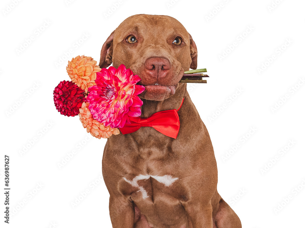 Cute brown dog, bow tie and bright flowers. Close-up, indoors. Studio shot. Congratulations for family, relatives, loved ones, friends and colleagues. Pets care concept