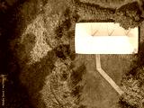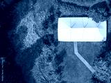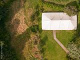 Drone top down view of a large wedding marquee seen located in a large private garden in mid summer.