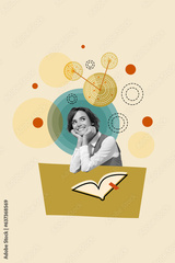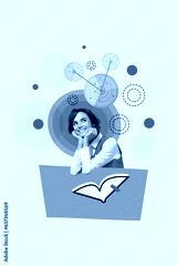 Vertical composite 3d photo collage of intelligent beautiful student girl dream about mystery secrets isolated creative drawing background