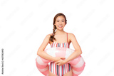 Summer portrait happy young asian woman Happy young woman wear swimsuit hold pink swim ring or inflatable tube ring Excited lady smile and loook at camera isolated on pink color background studio sh